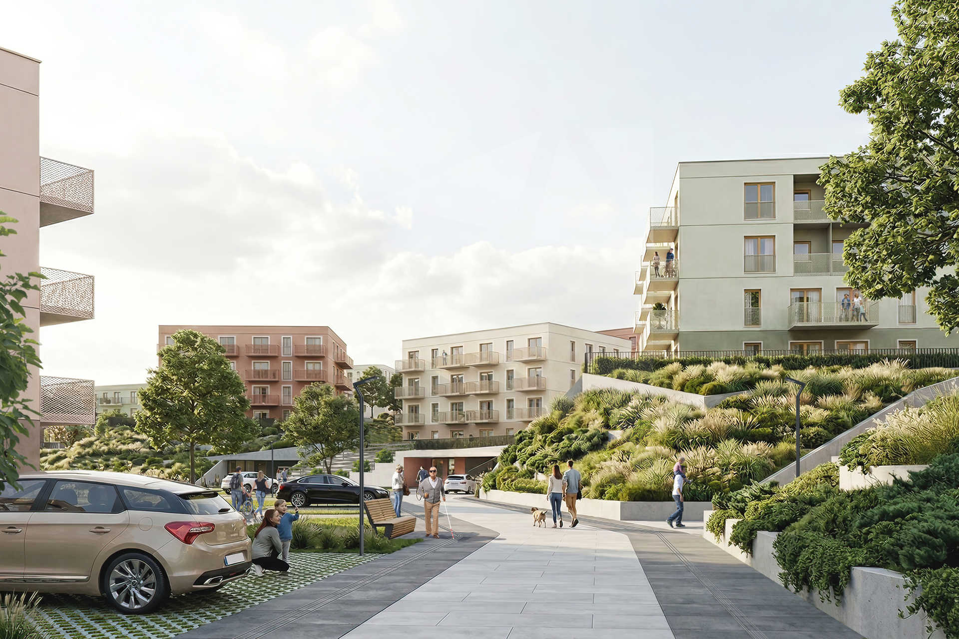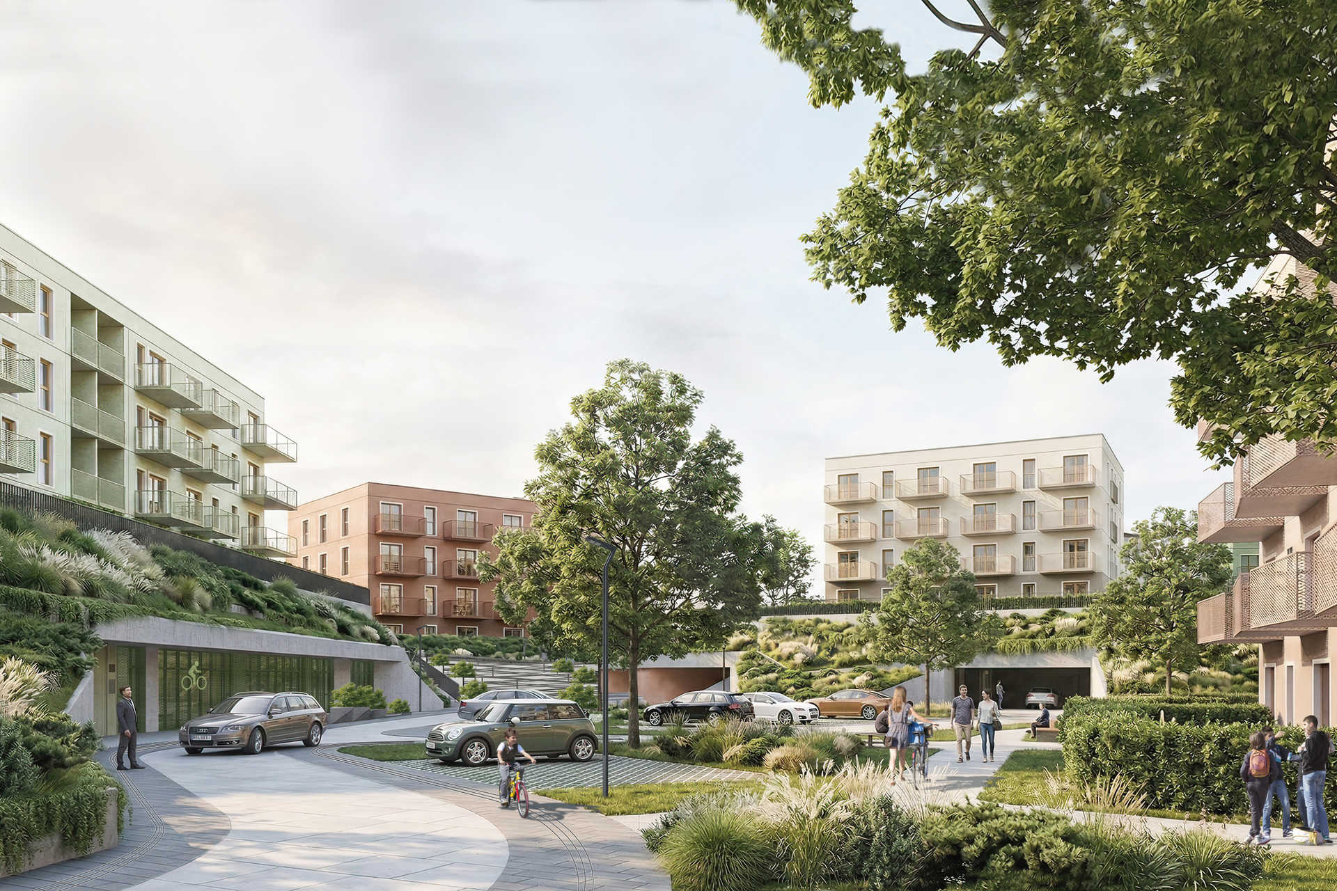 Ważnym elementem projektu są także przestrzenie wspólne – bezpieczne, czytelne i sprzyjające integracji. Naturalne ukształtowanie terenu wykorzystano do stworzenia zielonych wnętrz urbanistycznych i terenów rekreacyjnych, które zachęcają do odpoczynku i budowania relacji sąsiedzkich.