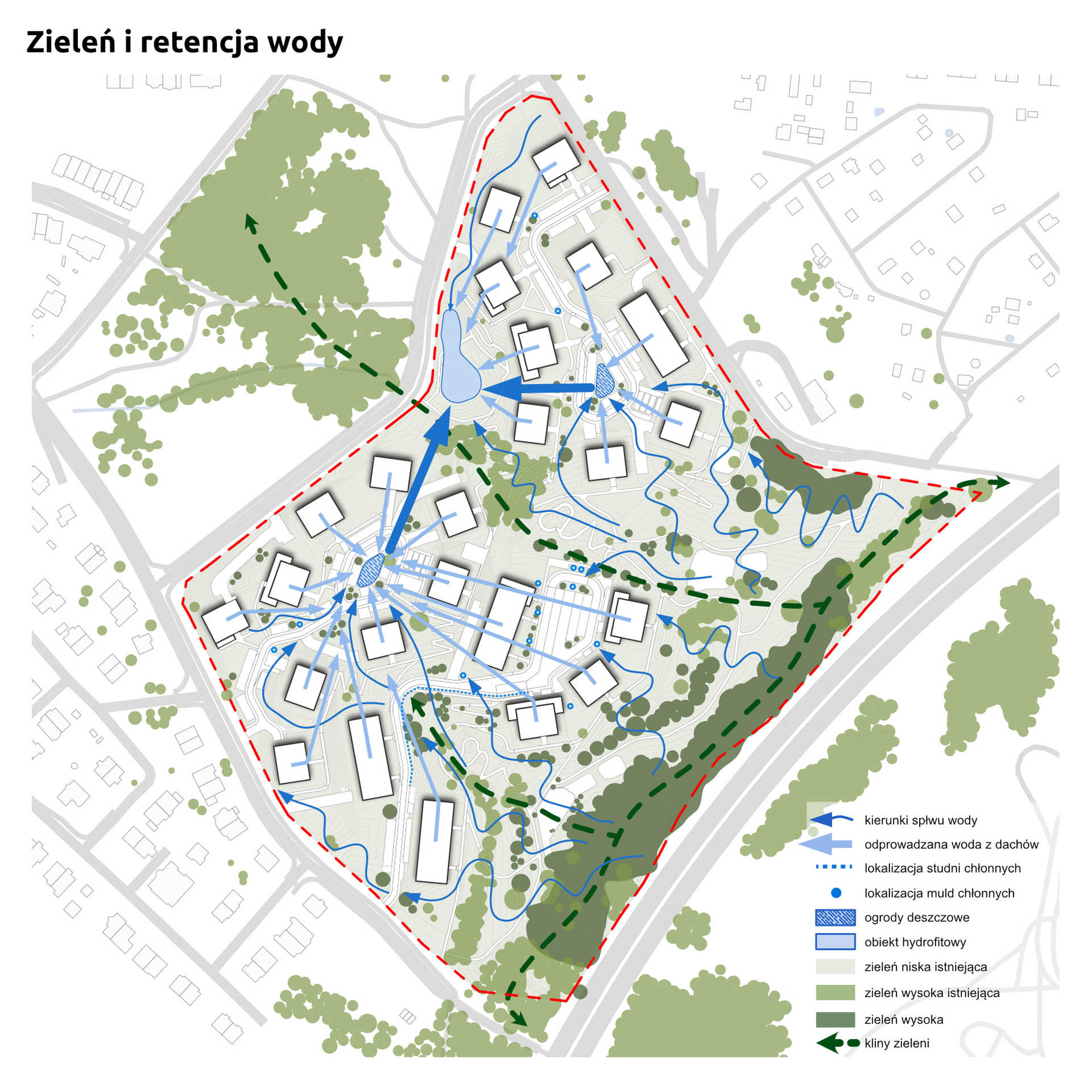 Duży nacisk położono na odpowiedzialne gospodarowanie wodą. System retencji został zaprojektowany tak, aby reagować na zmienne warunki pogodowe i intensywne opady, wspierając naturalny obieg wody w środowisku.